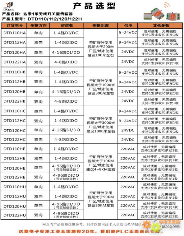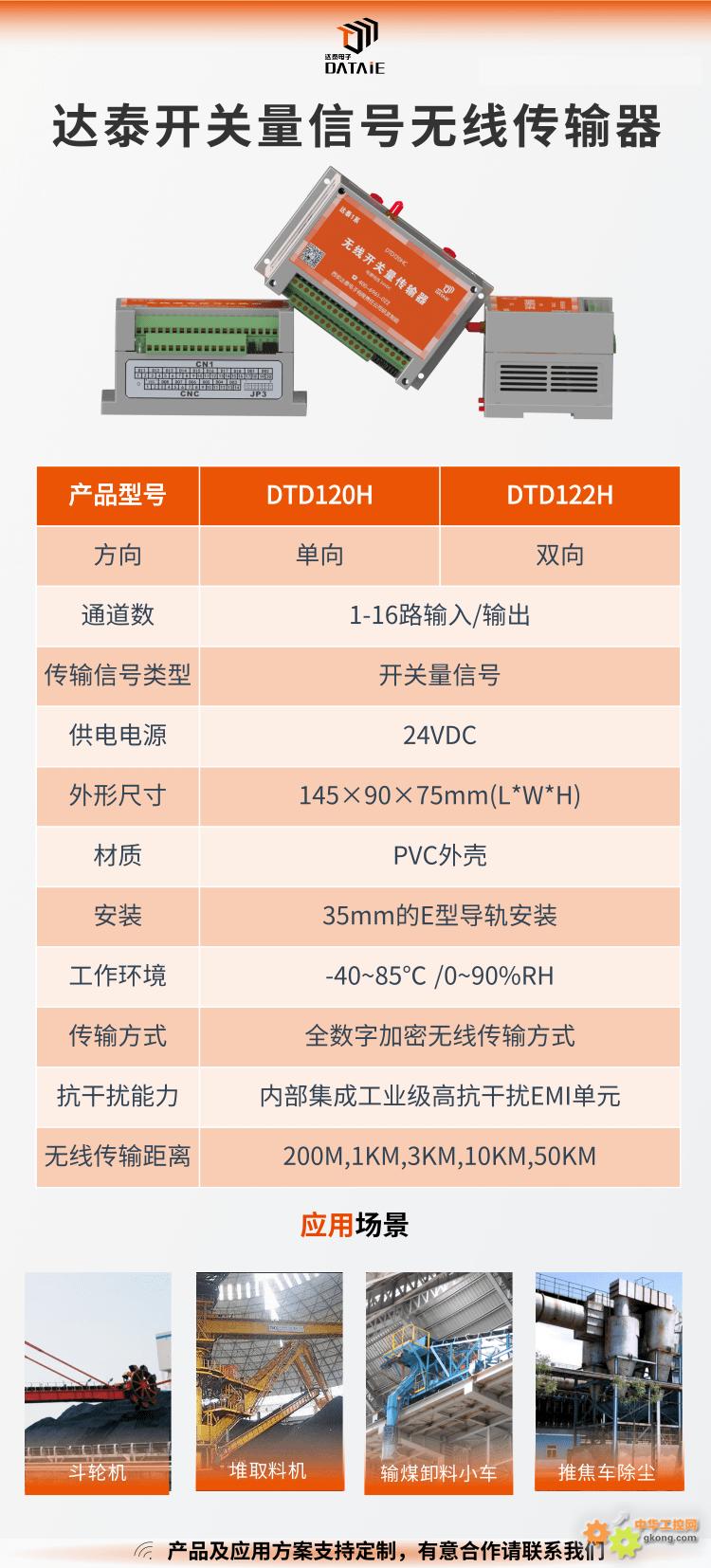 達(dá)泰1系工業(yè)級無線開關(guān)量傳輸器-DTD120H,可以直接代替有線進(jìn)行點(diǎn)對點(diǎn)、一點(diǎn)對多點(diǎn)、多點(diǎn)對一點(diǎn)的開關(guān)量信號單雙向傳輸。無線裝置無需編程,運(yùn)用全數(shù)字無線加密傳輸方式保證數(shù)據(jù)an quan 可靠,you xiao 傳輸距離50KM,后期無運(yùn)行費(fèi)用。DTD120H提供1-99路開關(guān)量信號(信道數(shù)可定制)輸入及輸出功能,發(fā)射端與接收端成套使用。無線通訊裝置發(fā)射端可接入開關(guān)量信號,例如,浮球開關(guān),PLC,電磁閥等設(shè)備;輸出端可接入數(shù)顯表,DCS,PLC等設(shè)備。